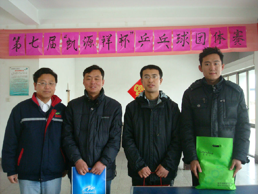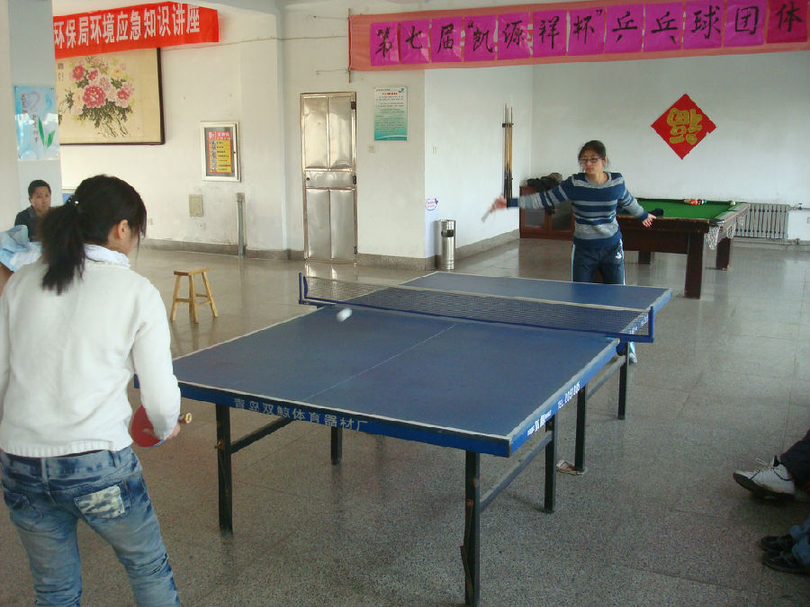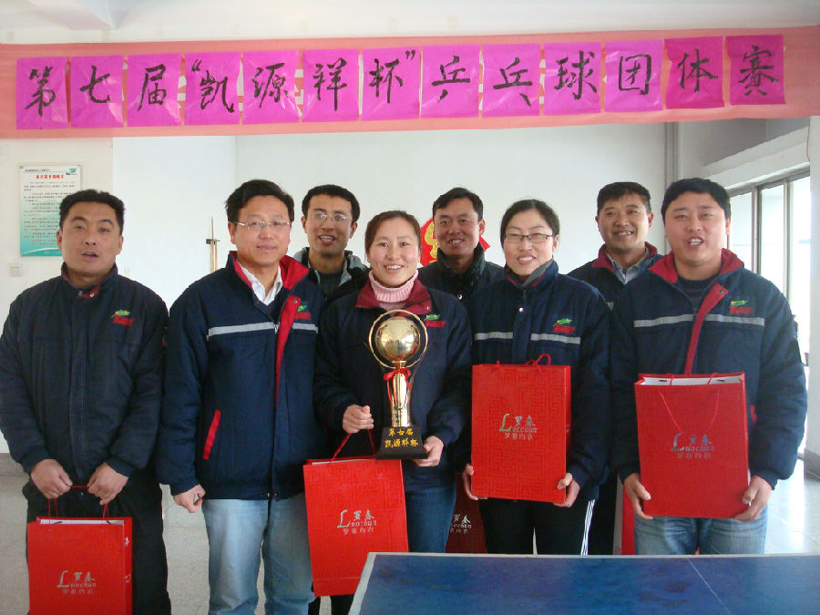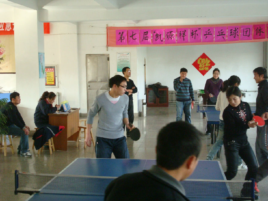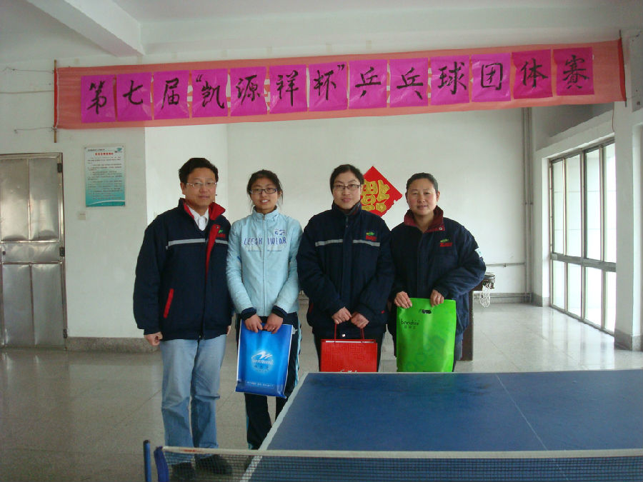 为了增加节日气氛,丰富职工业余生活,公司于2011年1月2日组织了第七届“凯源祥杯”乒乓球赛。本次比赛共有20余名选手报名参加。虽然大家平时没有经过专门的训练,但是比赛也异常激烈。本次比赛分:团体赛和个人赛。制剂销售实习人员也参加了此次比赛,在本次比赛中表现突出,打出了自己的风格。比赛激发了大家的拼搏热情与集体荣誉感,并以积极向上的态度投入到工作中去。